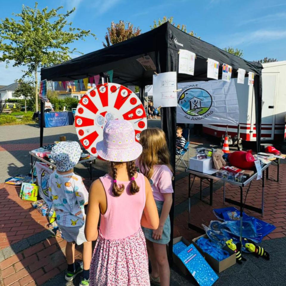 Mit viel Freude und Engagement betreuten Kinder unserer Schule das Glücksrad, an dem alle Kinder kostenlos drehen und tolle Preise gewinnen konnten. Besonders die jüngeren Gäste erhielten Unterstützung beim Drehen - so entstand ein fröhliches Miteinander, das Jung und Alt begeisterte und die Aussagen unserer Grundschulkinder unterstrichen: „Wir machen was zusammen“ und „Kinder sollen ernst genommen werden“ war auf den zuvor in den Klassen selbstgeschriebenen Bausteinen zu lesen.
